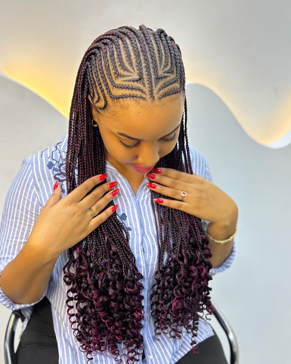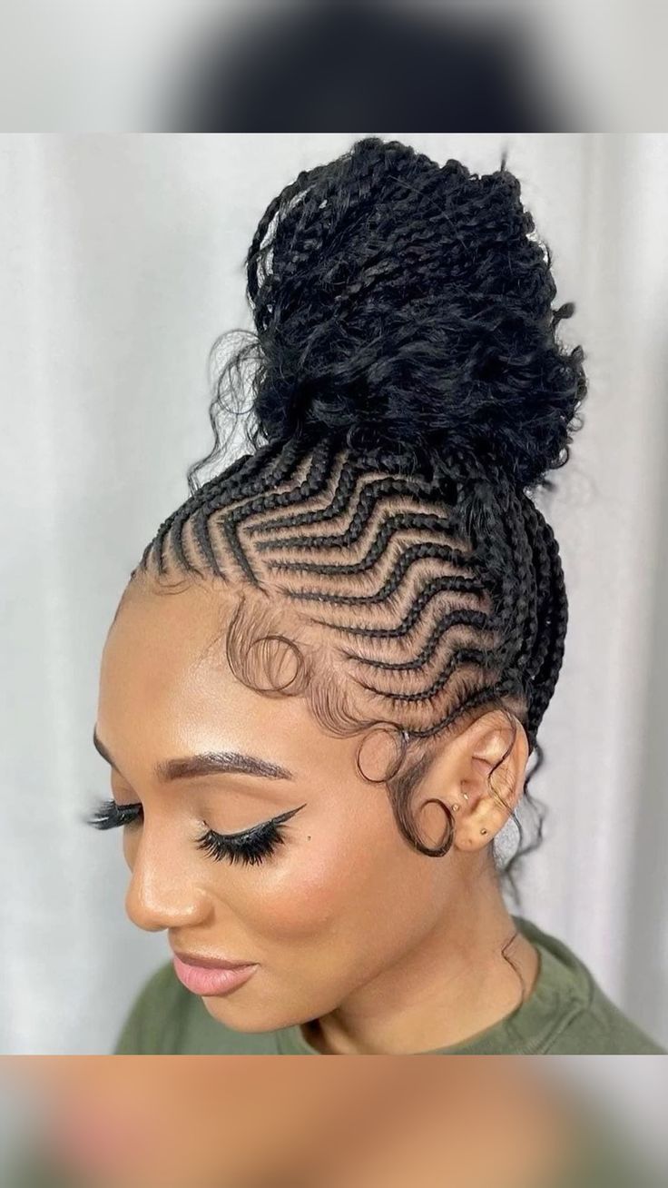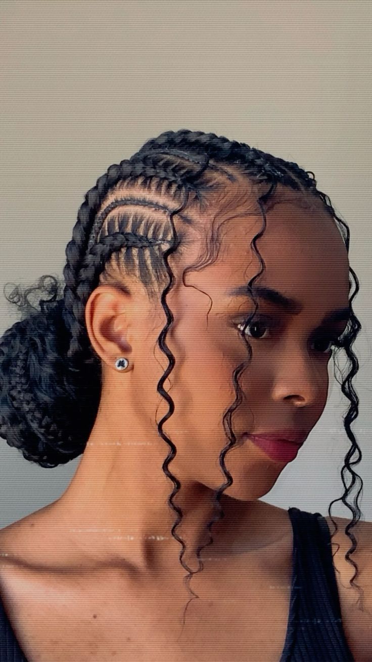 This style combines cornrows styles with precise, angular partings to form shapes like triangles, squares, hearts or freestyle lines.