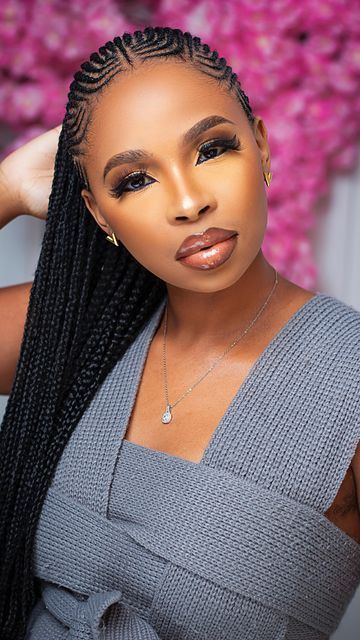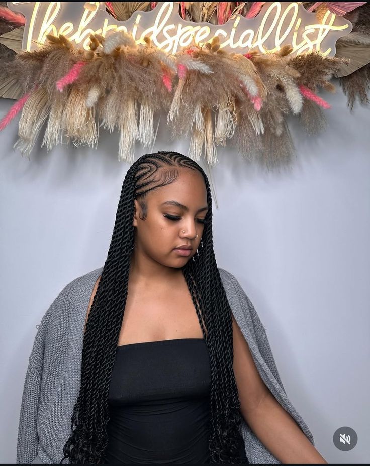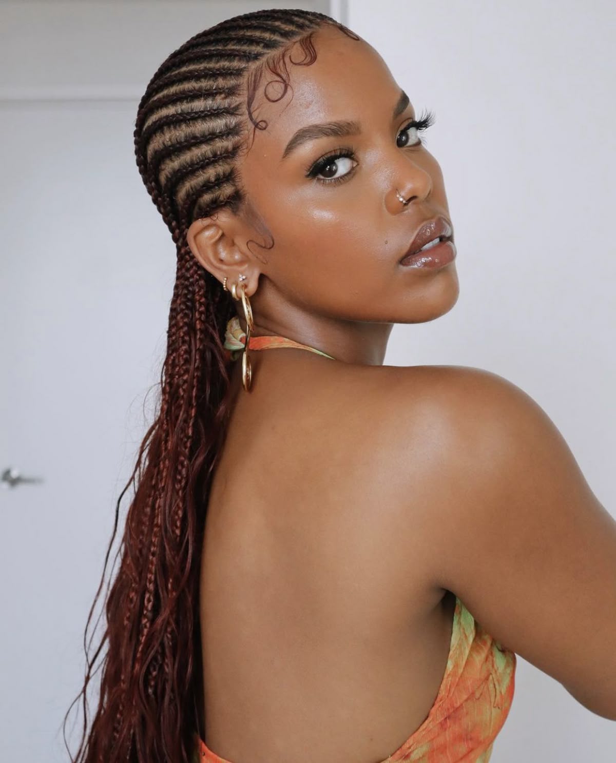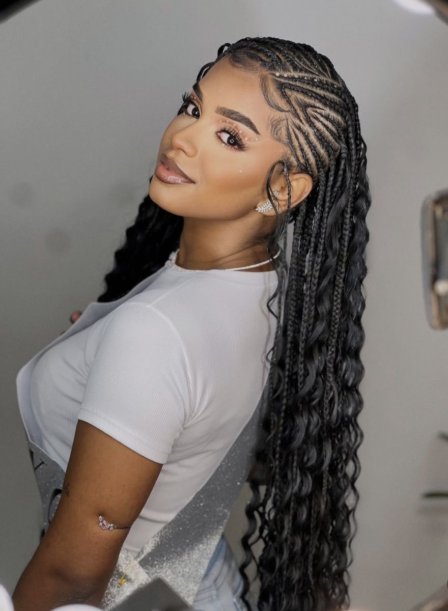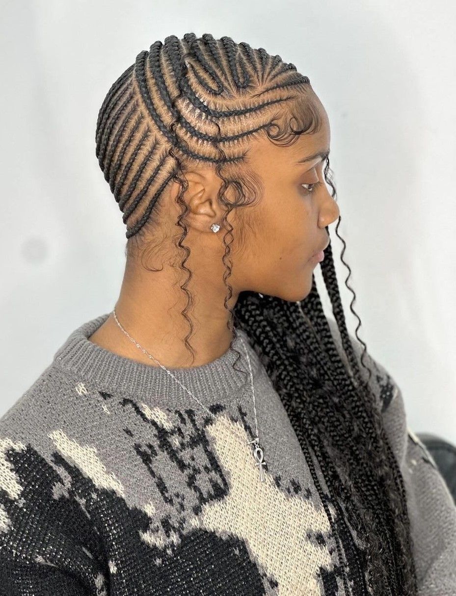 This style is simple, straight going back cornrows with or without design or pattern. The cornrows flow the natural curve of the scalp and transition into long individual braids in the back.